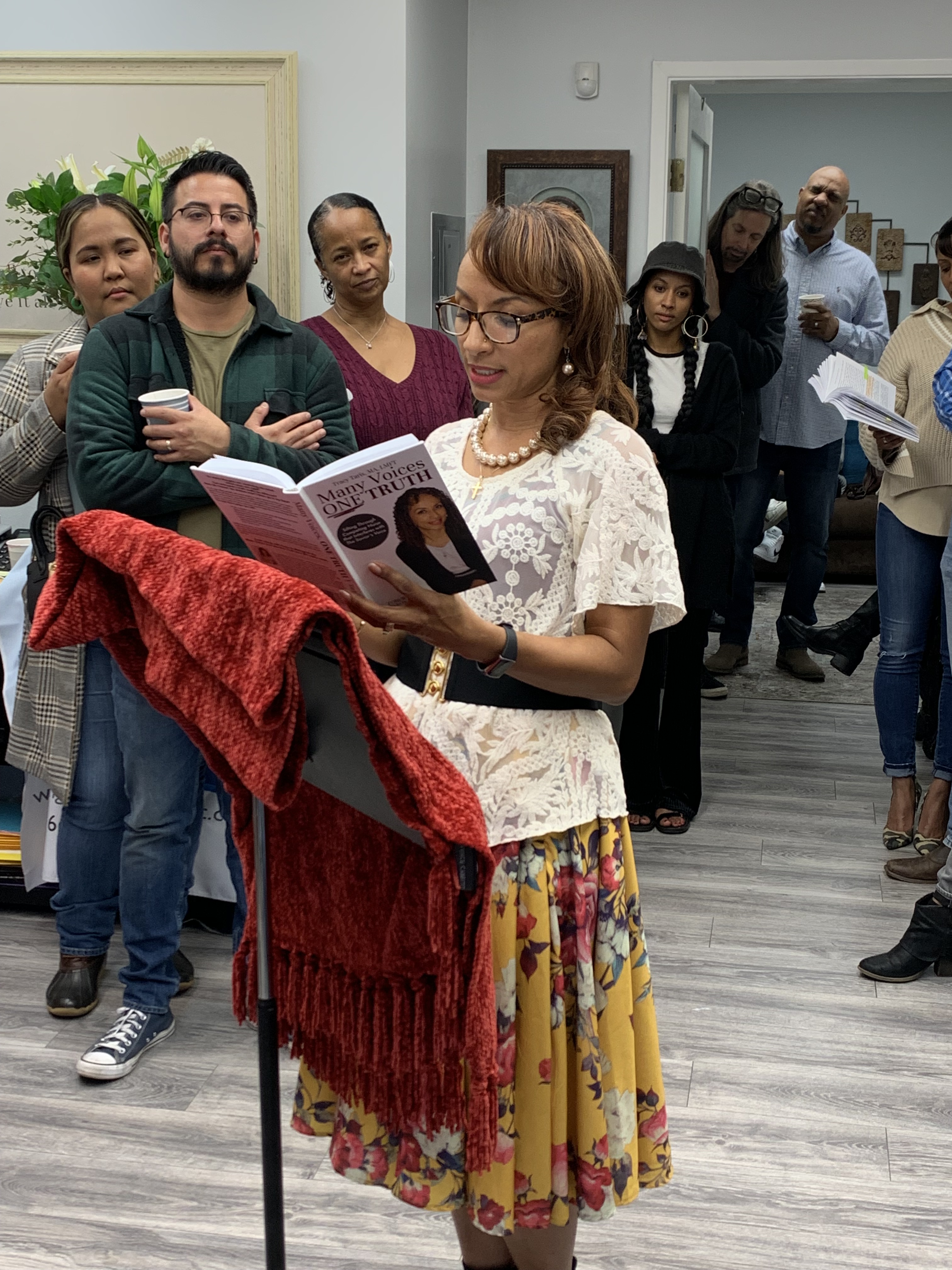 The amazing #tracytaris officially launched her new book #ManyVoicesONETRUTH this past weekend. Here she is at her office #HealingTheMindAndSpirit reading some pages from her book to a packed room of party-goers!